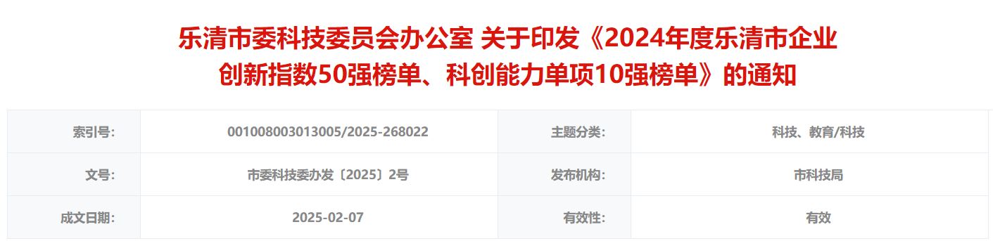 2024年度樂(lè)清市企業(yè)創(chuàng)新指數(shù)50強(qiáng)榜單